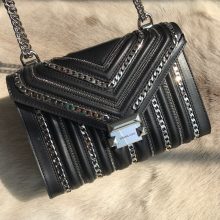 MK Whitney包包 MK原单黑色牛皮链条装饰单肩斜挎女包24CM 银色五金
