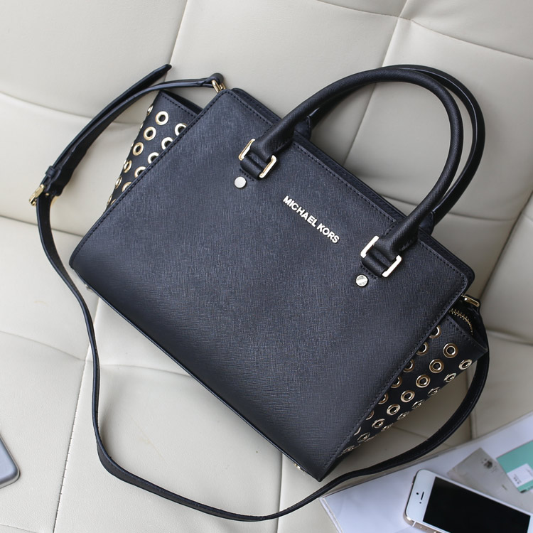 mk鸡眼包黑色出货 michael kors mk十字纹牛皮侧孔铆钉包手提女包