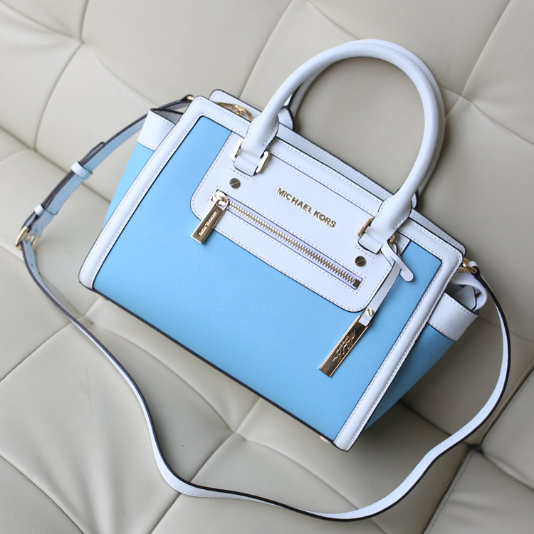 MK新款出货 十字纹牛皮 真皮拼色蝙蝠包 浅蓝拼白色 手提包