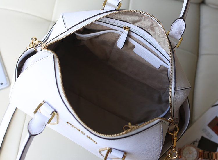 MK包包批发 秋冬专柜同步新款dressy/sutton杀手包小号十字纹牛皮手提女包 咖啡拼白色
