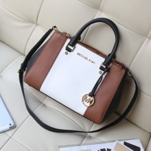 MK包包批发 秋冬专柜同步新款dressy/sutton杀手包小号十字纹牛皮手提女包 咖啡拼白色