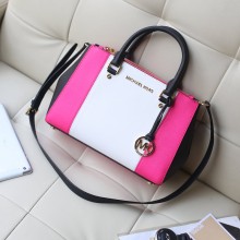 时尚新款女包 MK dressy/sutton 杀手包小号原版进口十字纹牛皮手提包 荧光玫红拼白色