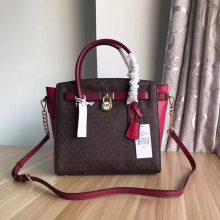 高档女包批发 MK迈克科尔斯拼色锁头包手提女包29CM 酒红色拼