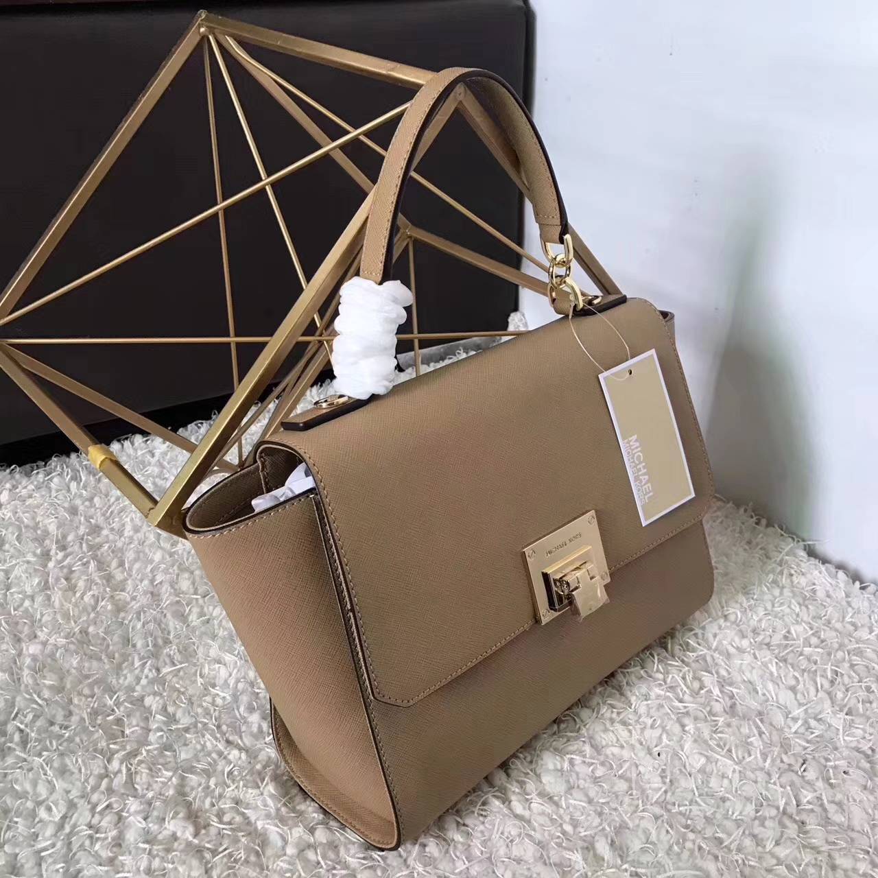 MK新款原单女包 迈克科尔斯进口十字纹牛皮秋千包手提女包26CM 卡其色