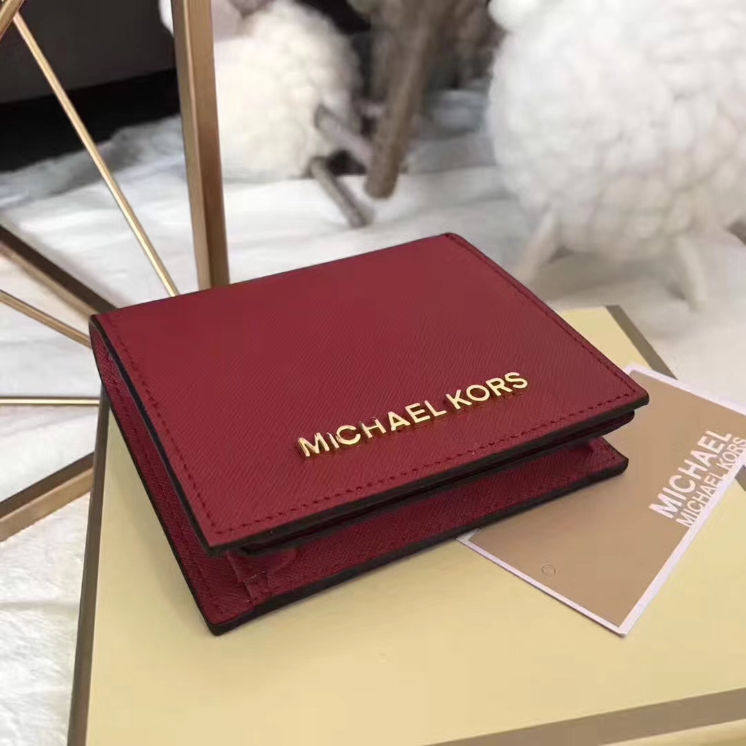 MK钱夹价格 迈克尔高仕大红色进口十字纹牛皮吸扣钱包卡包12CM