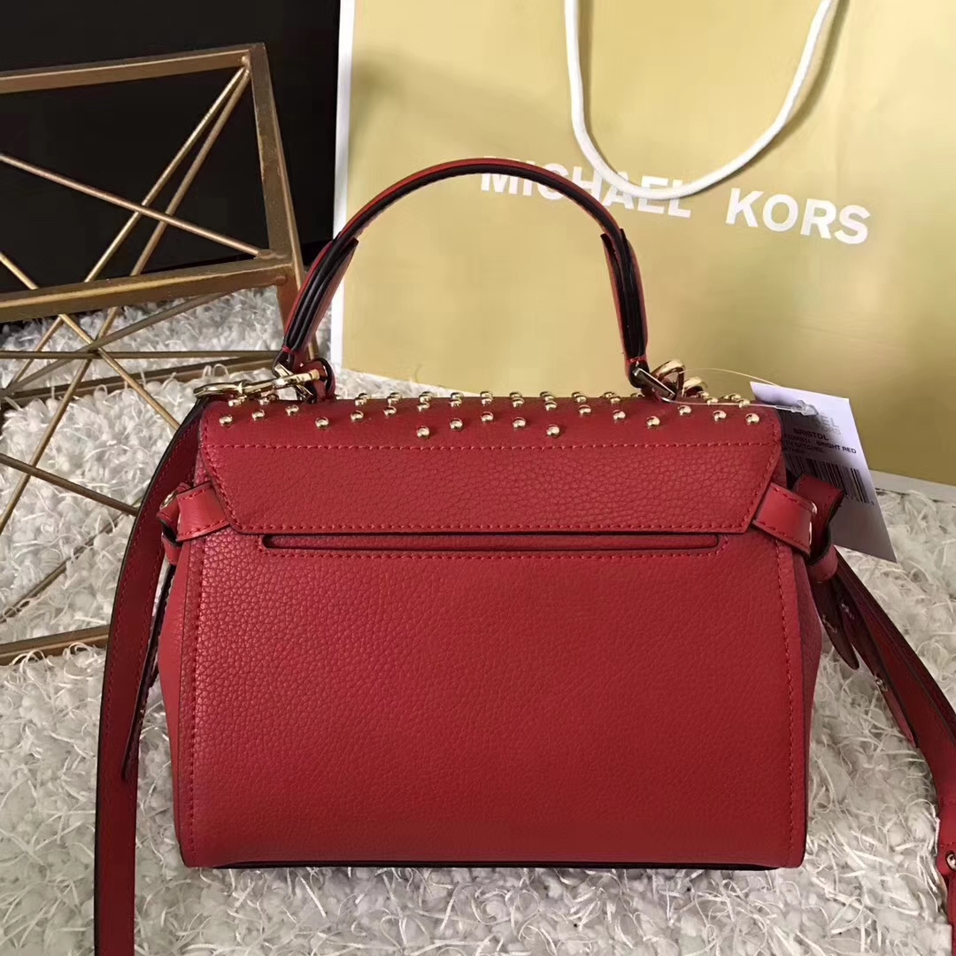 MK新款包包 迈克科尔斯摔纹牛皮Bristol翻盖铆钉剑桥包22cm 红色
