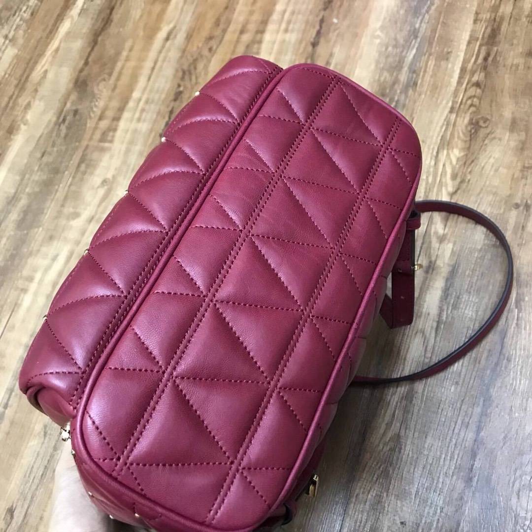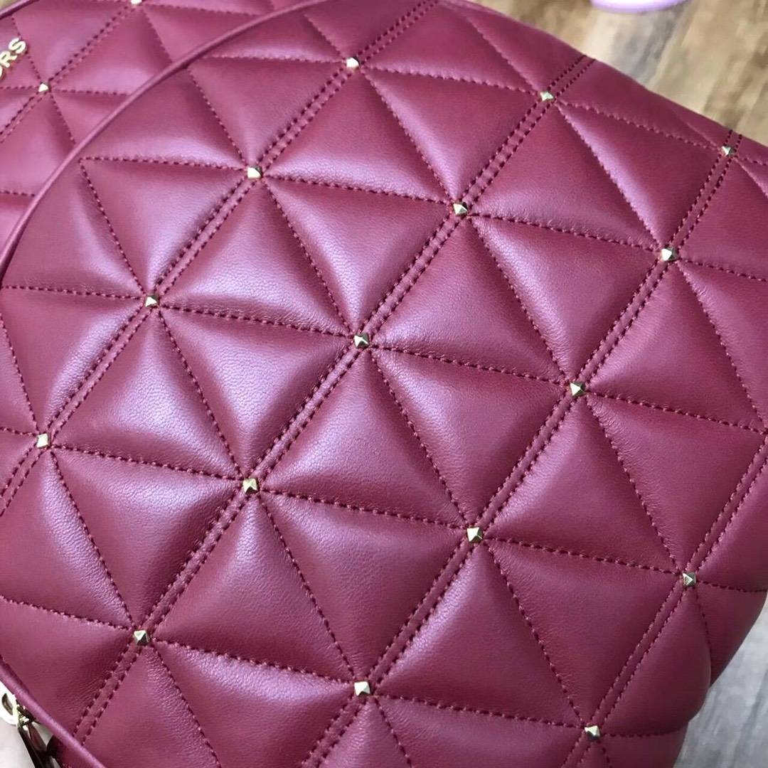 MK羊皮系列双肩背包,羊皮三角车线+铆钉装饰,背面和两侧都有插袋,实用又好看。上身效果非常棒!配防尘袋,尺寸26/14/31cm,颜色:酒红色