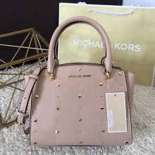 MK新款女包 迈克科尔斯进口手掌纹牛皮铆钉手提包女包23.5cm 粉色